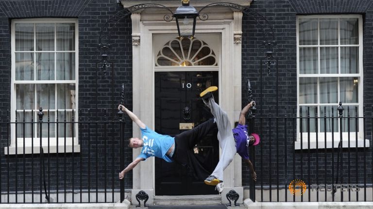 Màn biểu diễn Parkour bên ngoài tòa nhà số 10 phố Downing (dinh của Thủ tướng Anh) ở trung tâm London. Ảnh: Reuters
