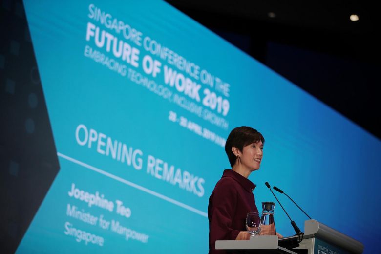 Bộ trưởng Nhân lực Singapore, bà Josephine Teo​ phát biểu tại lễ khai mạc Hội nghị Singapore về Tương lai của Việc làm. Ảnh: Straits Times