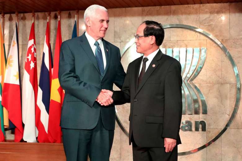 | Phó Tổng thống Mỹ Mike Pence (bên trái) trong cuộc gặp với Tổng Thư ký ASEAN Lê Lương Minh ở thủ đô Jakarta, Indonesia ngày 20/4 vừa qua. Ảnh: Reuters |
