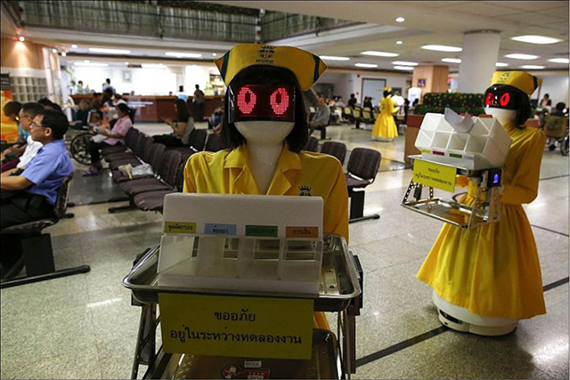 Robot hướng dẫn tự động được sử dụng tại Bệnh viện Đa khoa Mongkutwattana ở Bangkok, Thái Lan để tiết kiệm chi phí tuyển dụng và giải quyết tình trạng thiếu nhân viên. Ảnh: EPA-EFE