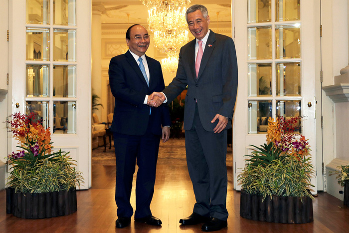 Thủ tướng Singapore Lý Hiển Long tiếp đón Thủ tướng Nguyễn Xuân Phúc ngày 25-4 - Ảnh: Reuters