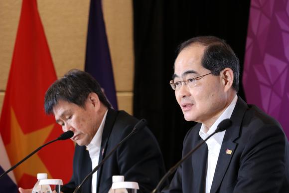 Bộ trưởng Thương mại và Công nghiệp Singapore Lim Hng Kiang (bên phải) trong một cuộc họp báo ngày 2/3. Ảnh: Nikkei