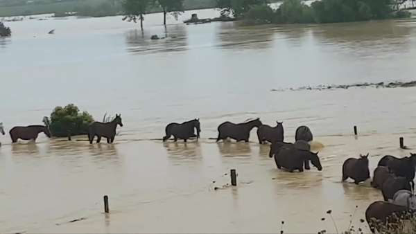 | Đàn ngựa chạy khỏi lũ lụt do mưa lớn ở Đảo Bắc, New Zealand. Ảnh: Onenewspage |