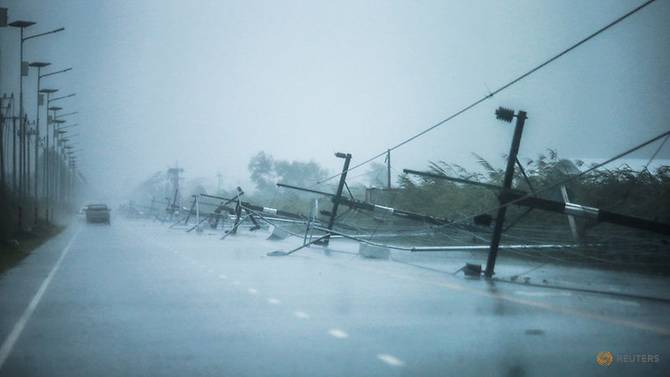 Hàng loạt cột điện đổ ngã trên một con đường khi cơn bão nhiệt đới Pabuk đổ bộ tỉnh Nakhon Si Thammarat, phía nam Thái Lan ngày 4/1. Ảnh: Reuters