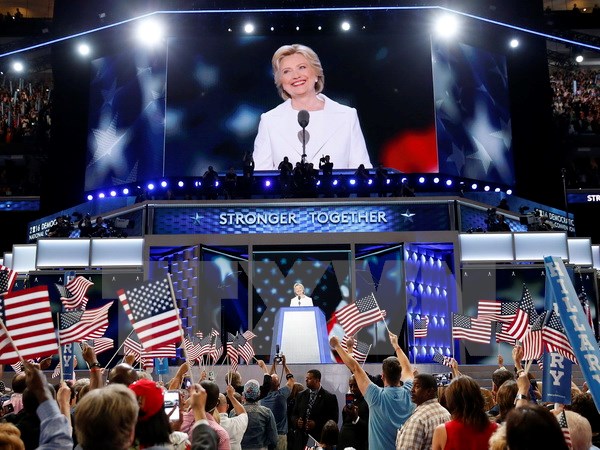Ứng cử viên Tổng thống của đảng Dân chủ Hillary Clinton phát biểu tại lễ bế mạc đại hội. (Nguồn: AFP/TTXVN)