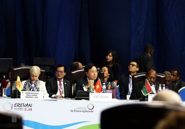 Phó Thủ tướng Bộ trưởng Phạm Bình Minh phát biểu tại Hội nghị Cấp cao Pháp ngữ 17. Ảnh: Tâm Hằng/TTXVN