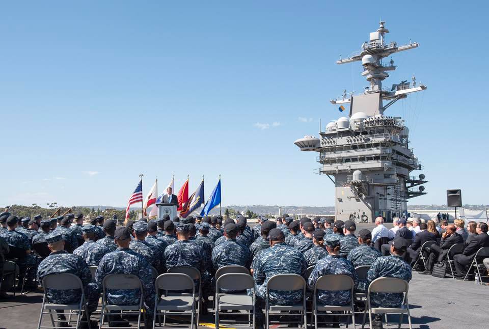 Bộ trưởng Quốc phòng Mỹ Ash Carter phát biểu tại căn cứ USS Carl Vinson, California, Mỹ ngày 29/9/2016. Ảnh: CNN