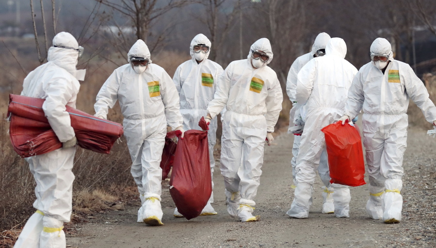 Các nhân viên xử lý gia cầm bị nhiễm bệnh ở Hàn Quốc. Ảnh: Yonhap.