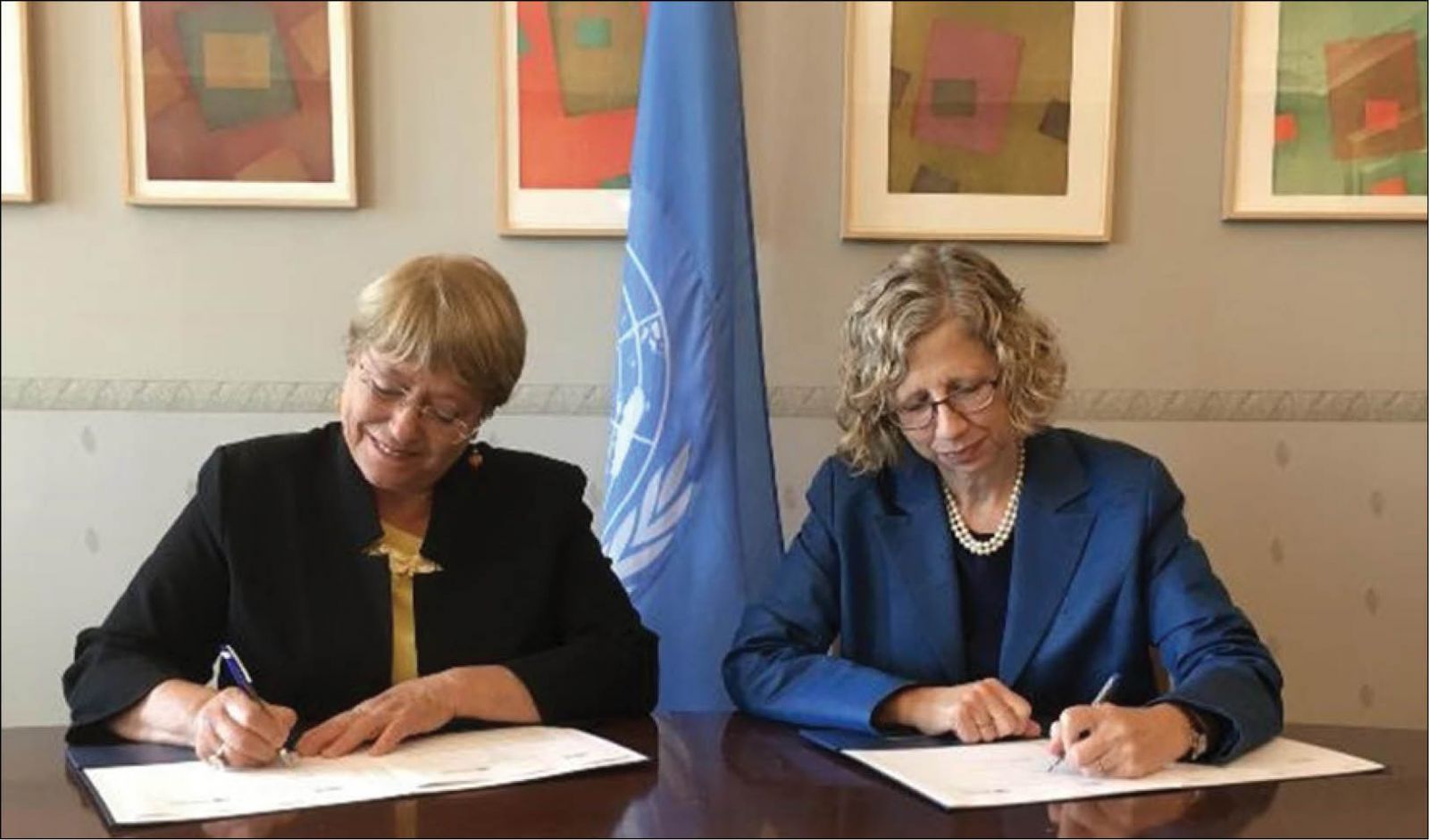 Lãnh đạo UNEP và OHCHR ký kết thỏa thuận. Ảnh: Devdiscourse