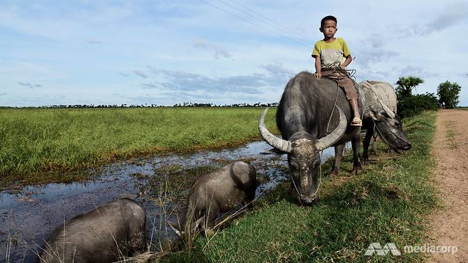 Cậu bé người Campuchia chăn trâu bên cạnh ruộng lúa nổi. Ảnh: CNA
