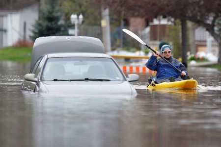 Một phụ nữ chèo xuồng qua chiếc xe bị bỏ lại trên con đường ngập nước ở Gatineau, Quebec, Canada. Ảnh: Reuters