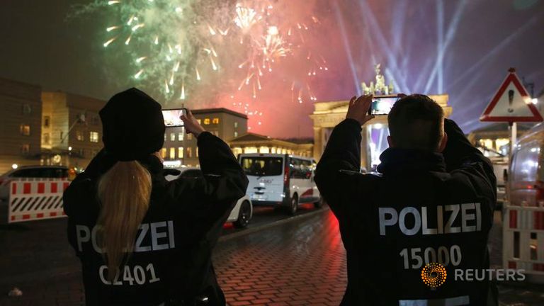 | Cảnh sát Đức chụp ảnh pháo hoa trong đêm Giao thừa ở thủ đô Berlin, Đức. Ảnh: Reuters |