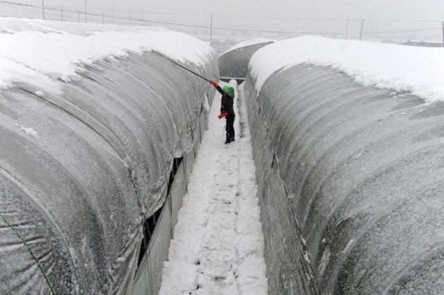 Nông dân dọn tuyết trên mái của một nhà kính tại Dongyang, tỉnh Chiết Giang, phía đông Trung Quốc. Ảnh: AFP