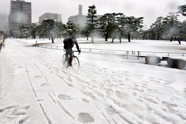 Một người đàn ông đạp xe trên con đường đầy tuyết ở thủ đô Tokyo, Nhật Bản. Ảnh: AFP
