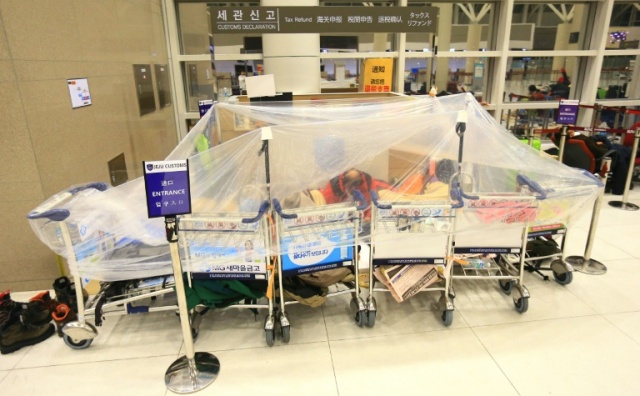 Du khách mắc kẹt đang ngồi dưới một lều tạm được dựng bằng xe đẩy hành lý tại sân bay Jeju, Hàn Quốc. Ảnh: AFP