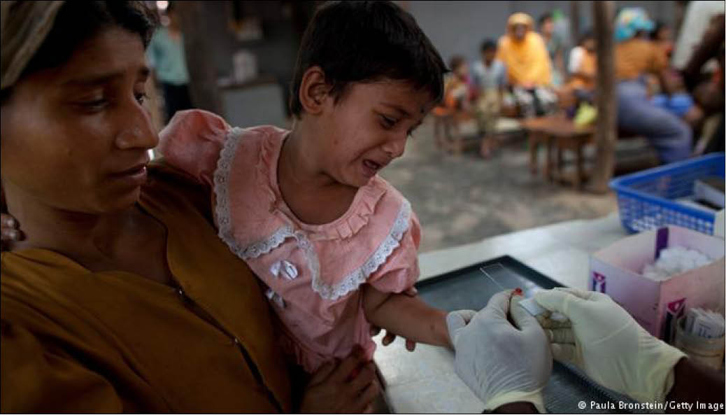 Bác sĩ thử máu kiểm tra bệnh sốt rét cho một em bé. Ảnh: DW