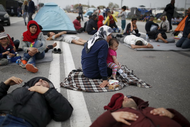 Người di cư và người tị nạn biểu tình nằm chặn một xa lộ ở thị trấn Polykastro (Hi Lạp), gần biên giới với Macedonia, ngày 2-4 để phản đối các chính sách tiếp nhận mới - Ảnh: Reuters
