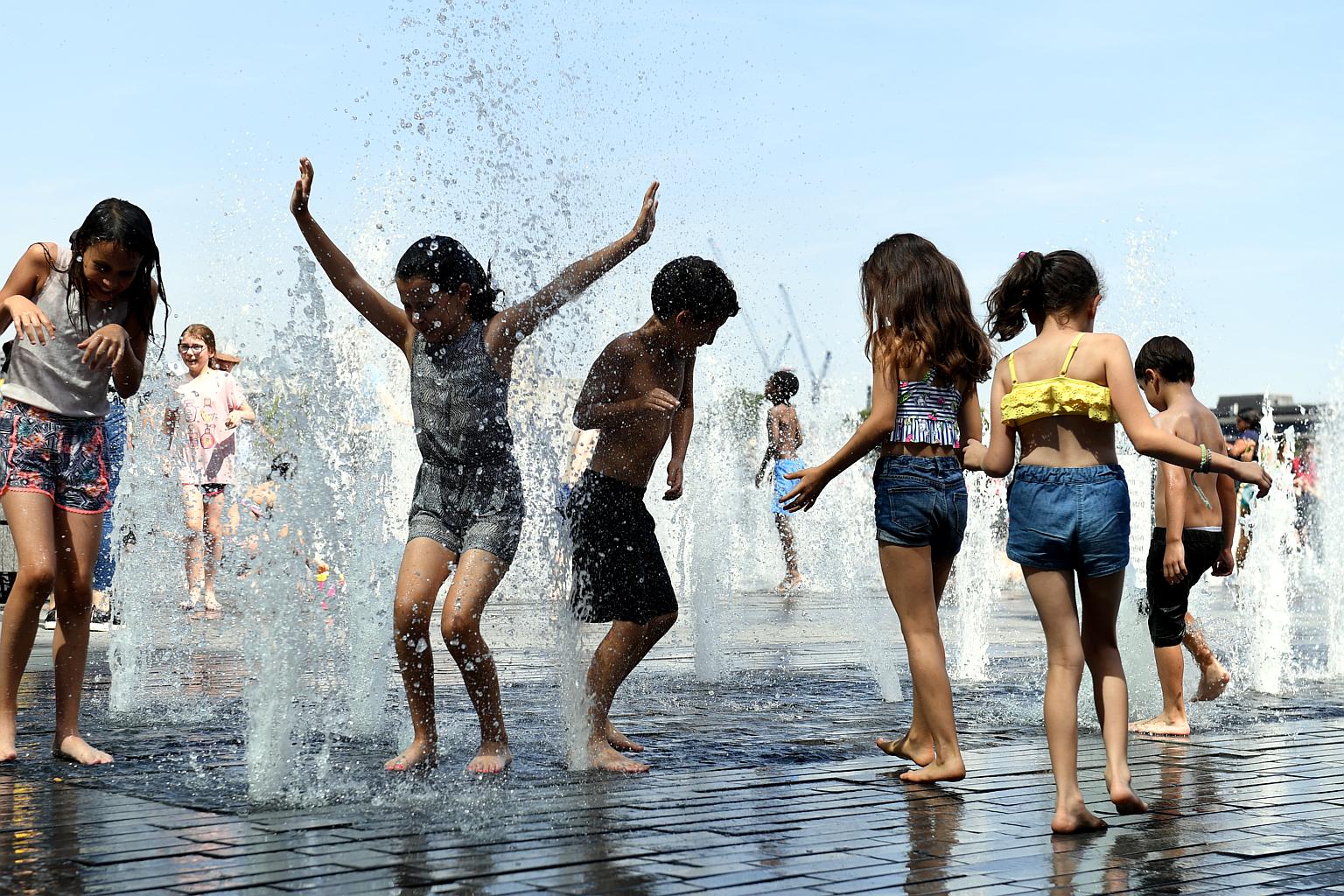 Trẻ em làm mát ở các đài phun nước bên bờ sông Thames, trong đợt nắng nóng diễn ra liên tục ở thủ đô London, Anh. Ảnh: EPA-EFE