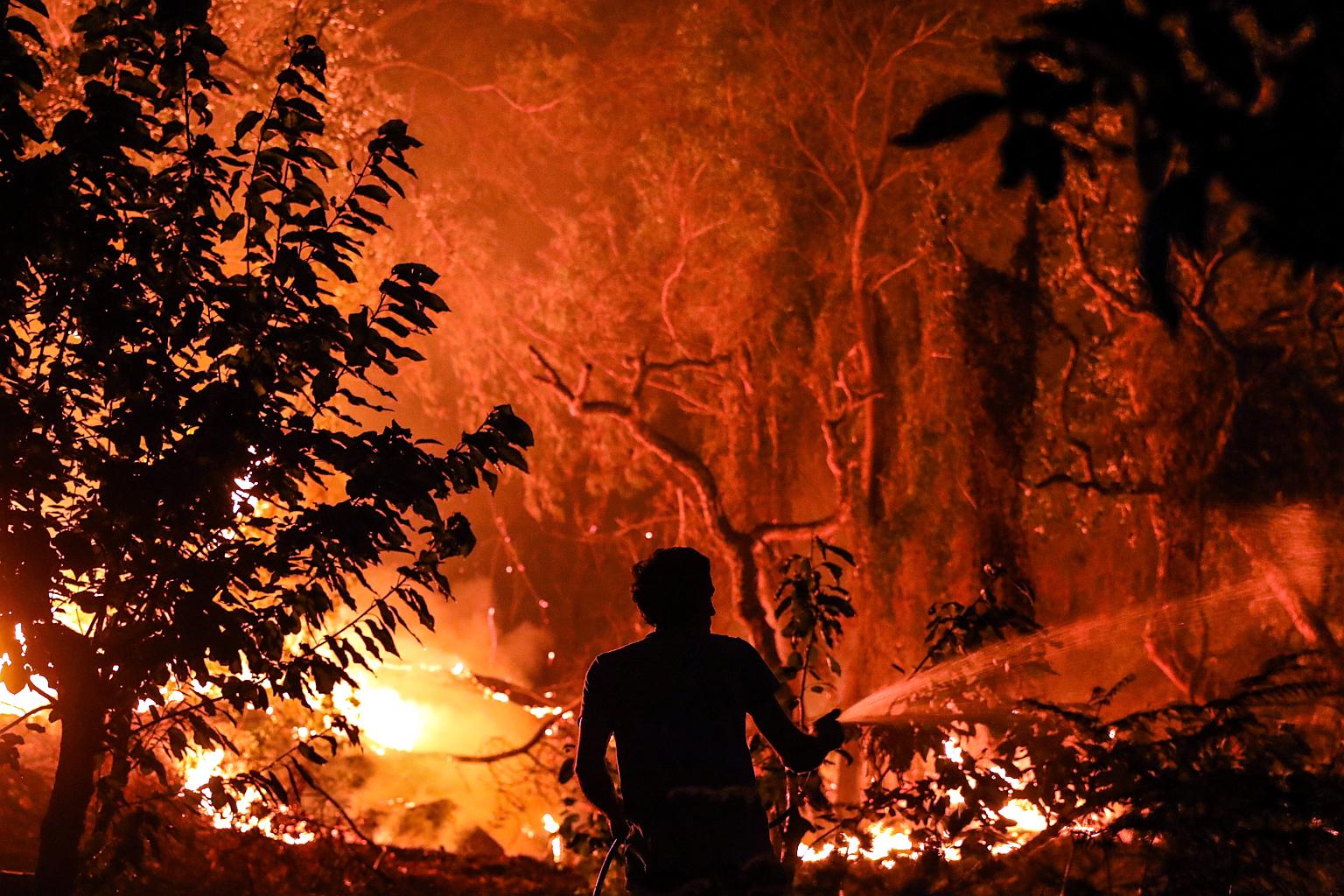 Người dân địa phương cố gắng dập tắt một đám cháy rừng, đã khiến 44 người bị thương và buộc phải sơ tán khu nghỉ mát, trong khu vực Barranco de Banho của Caldas de Monchique, Bồ Đào Nha ngày 6/8. Ảnh: EPA-EFE​
