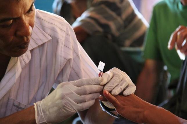 Bác sĩ đang lấy mẫu xét nghiệm sốt rét ở Châu Phi. Ảnh: Reuters