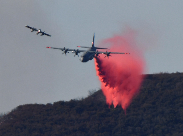 Máy bay quân sự được huy động để rải hóa chất chống cháy xuống khu vực xung quanh đám cháy Thomas - đám cháy lớn nhất hiện nay ở nam California - Ảnh: REUTERS