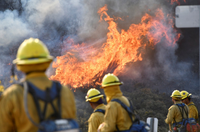 Lính cứu hỏa quan sát đám cháy - Ảnh: REUTERS