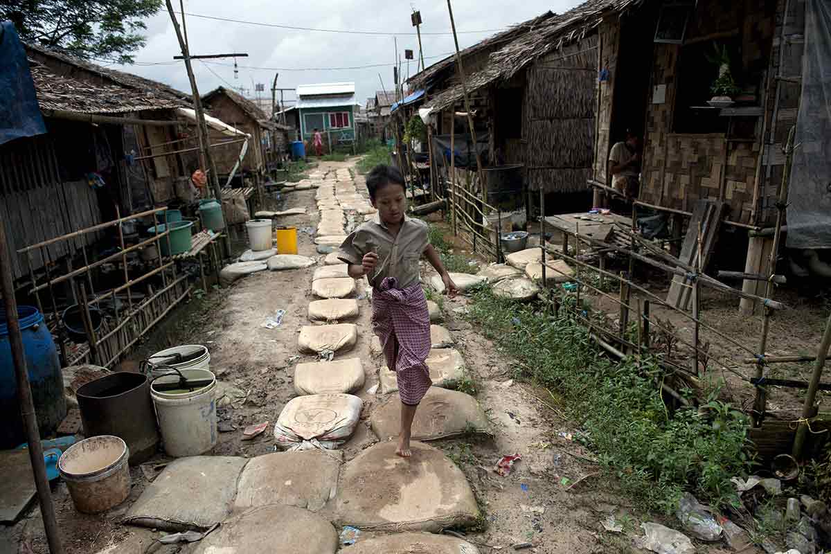Một cậu bé chạy qua những ngôi nhà bằng tre được xây dựng ở vùng ngoại ô thành phố Yangon, Myanmar. Ảnh: AFP