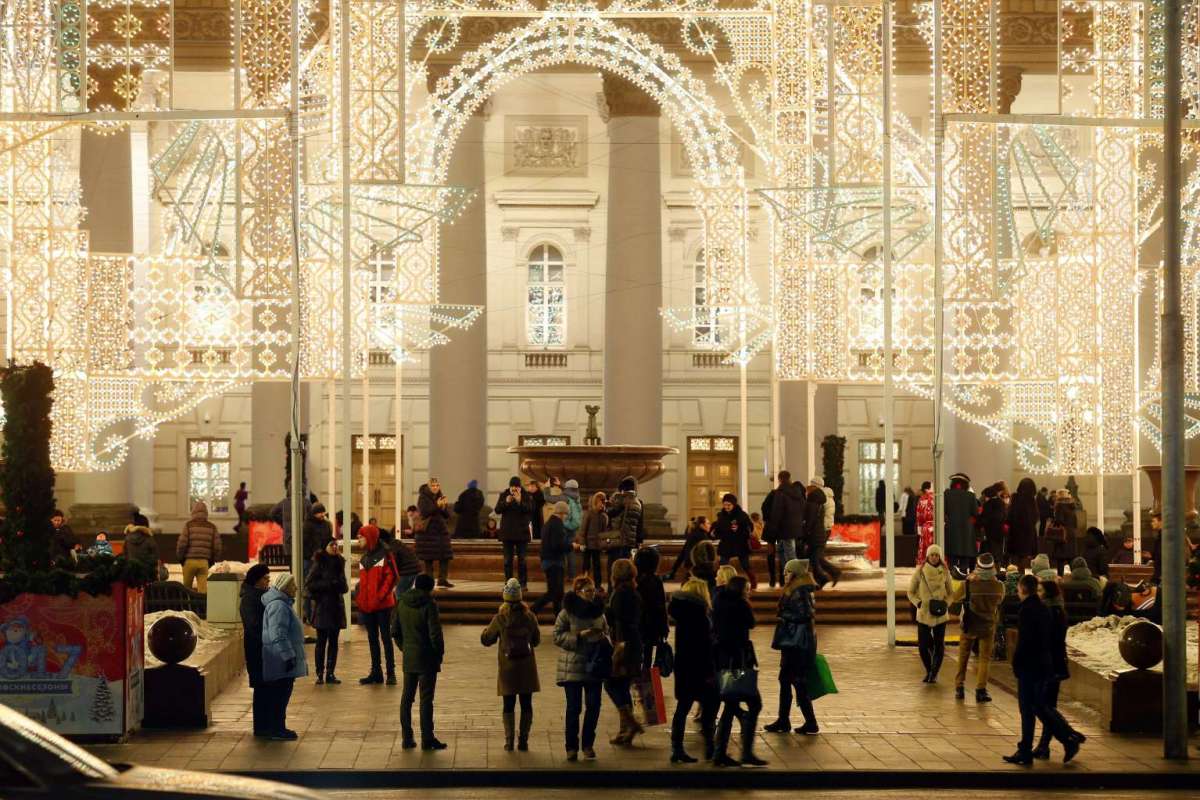 11. Người đi bộ dọc theo một con đường được trang trí cầu kỳ phía trước Nhà hát Bolshoy (Big Theater) tại Moscow, Nga, ngày 25/12/2016. Ảnh: EPA