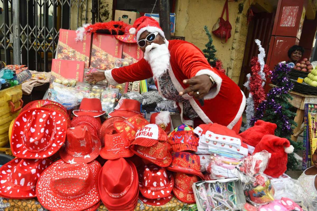 17. Một người bán hàng rong bên lề đường ăn mặc như ông già Noel bày bán các sản phẩm Giáng sinh ở Lagos, Nigeria, ngày 24/12/ 2016. Ảnh: AFP