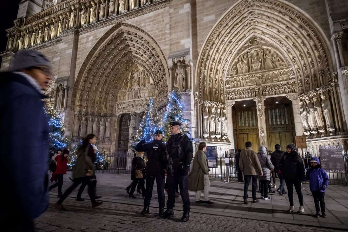18. Nâng cao cảnh giác trước nguy cơ tấn công khủng bố, các sĩ quan cảnh sát Pháp đững gác tại Nhà thờ Notre Dame trong khi các tín đồ kéo đến đây trong đêm Giáng sinh tại Paris, Pháp. Ảnh: EPA
