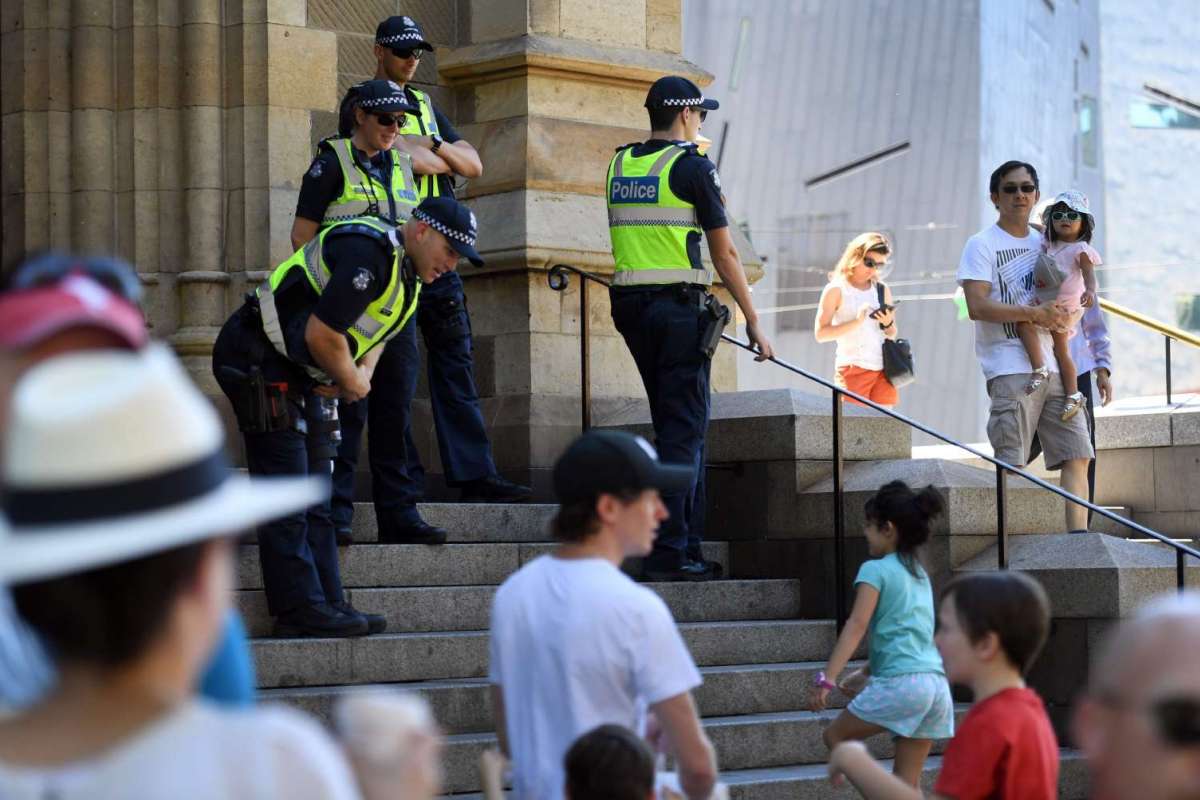 5. Cảnh sát đứng gác bên ngoài Nhà thờ St Paul ở Melbourne khi các tín đồ đến thăm trong dịp Giáng sinh ngày 25/12/2016. Ảnh: EPA