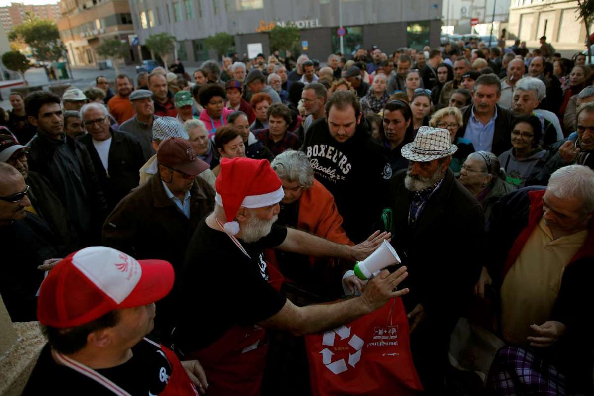 7. Những người dân đứng chờ để nhận thức ăn trong một buổi phân phối thực phẩm hàng ngày của tổ chức phi chính phủ Angeles Malaguenos de la Noche (Những thiên thần trong đêm) vào đêm Giáng sinh trên một đường phố ở trung tâm thành phố Malaga, Tây Ban Nha. Ảnh: REUTERS