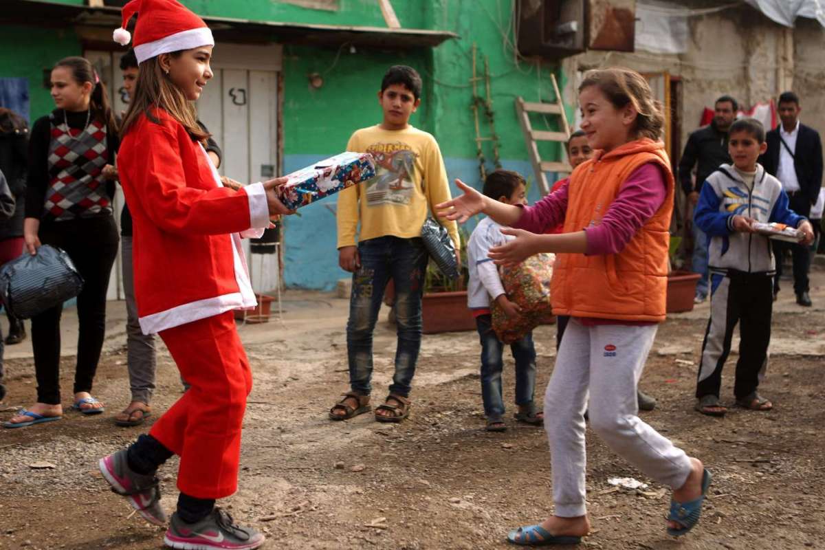 8. Hình ảnh cảm động khi một bé gái Lebanon mặc đồ ông già Noel trao quà cho một người tị nạn Syria vào ngày 24/12/2016 trong một khu ổ chuột ở thành phố Dbayeh, phía bắc của Beirut. Ảnh: AFP