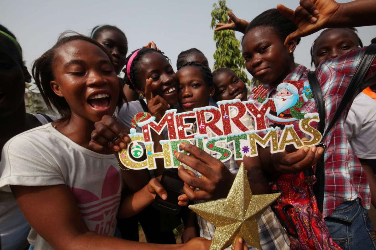 9. Các bé gái Liberia tạo dáng chụp ảnh với biểu tượng Giáng sinh ở Trung tâm Thanh niên ở Monrovia, Liberia, ngày 24/12/2016. Ảnh: EPA