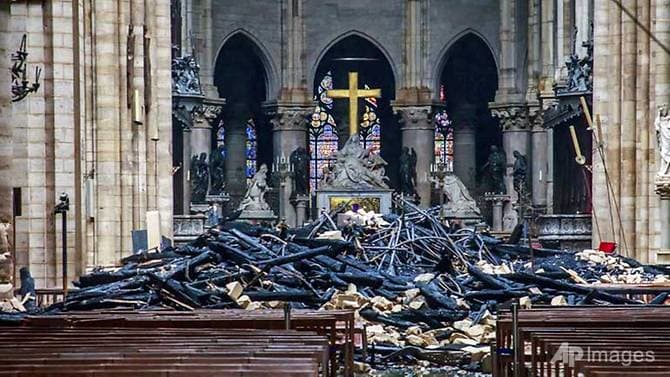 Cây thánh giá vàng và bức tượng vẫn còn nguyên vẹn cạnh đống đổ nát trong nhà thờ Đức Bà. Ảnh: CNA