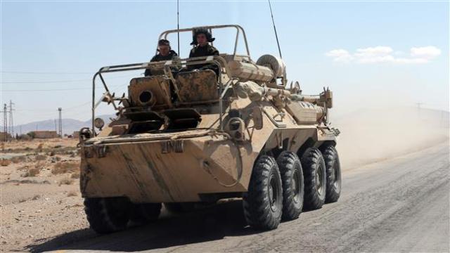 Binh sĩ Nga trên một chiếc xe bọc thép gần thành cổ Palmyra, Syria. Ảnh: AFP