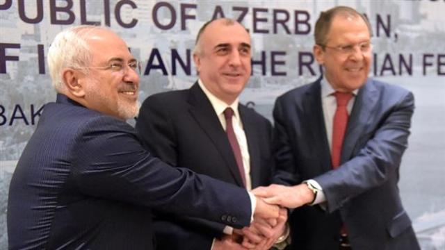 Từ trái sang: Ngoại trưởng Iran Mohammad Javad Zarif, Bộ trưởng Ngoại giao Azerbaijan Elmar Mammadyarov và Ngoại trưởng Nga Sergei Lavrov ở Baku, Azerbaijan. Ảnh: AP