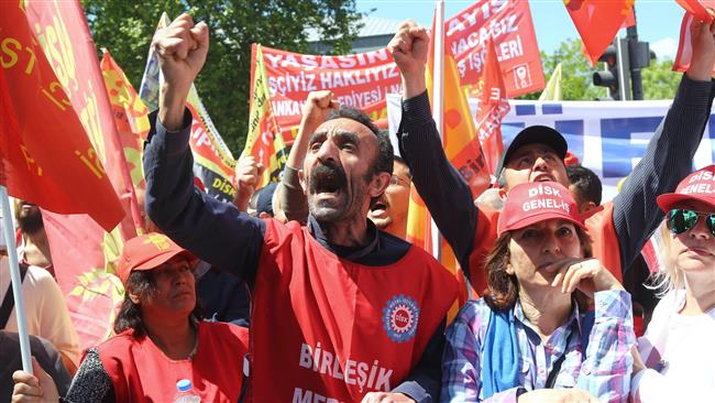 Người biểu tình Thổ Nhĩ Kỳ hô vang khẩu hiệu bảo vệ người lao động trong ngày Quốc tế Lao động trong ngày 1/5/2016 được tổ chức tại thủ đô Ankara. Ảnh: AFP
