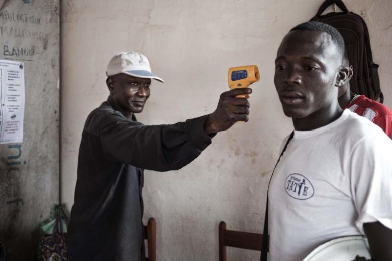 Nhân viên y tế kiểm tra nhiệt độ của một người đến từ Cộng hòa Dân chủ Congo tại thủ đô Bangui, Cộng hòa Trung Phi. Ảnh: AFP