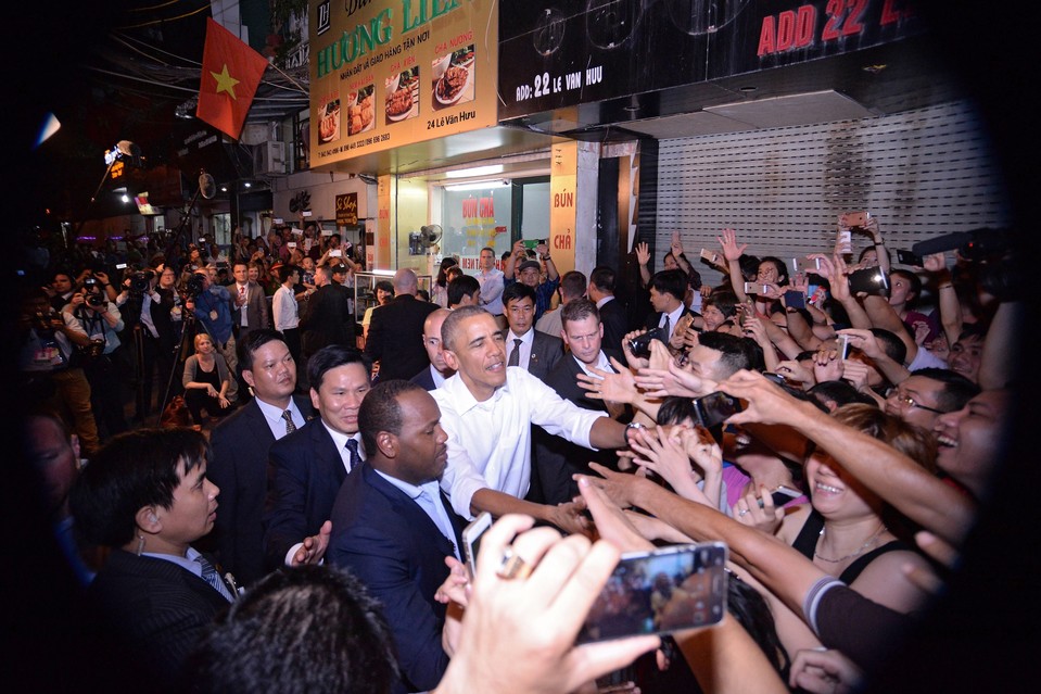 Tổng thống Mỹ Barack Obama bắt tay người dân sau khi rời khỏi quán bún chả Hương Liên ở Hà Nội tối 23/5. Ảnh: EPA