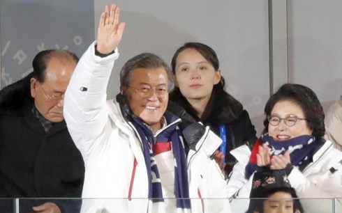 Tổng thống Hàn Quốc Moon Jae-in cùng phu nhân Kim Jung-sook (áo trắng) dự khán lễ khai mạc Olympic PyeongChang cùng bà Kim Yo-jong (áo đen đứng sau)- em gái nhà lãnh đạo Triều Tiên Kim Jong-un. Ảnh: Reuters