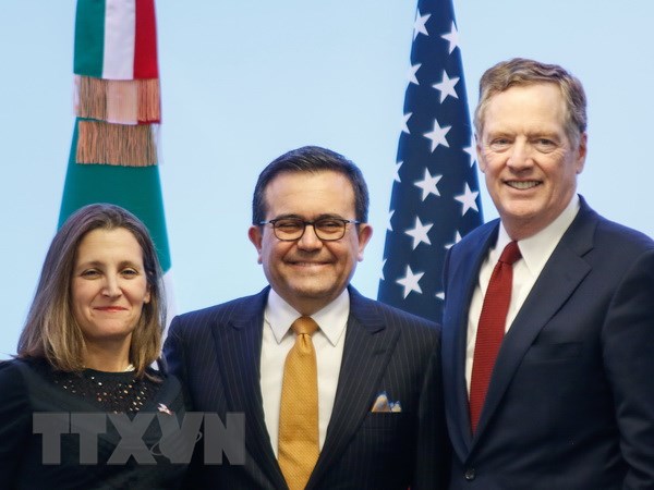 Đại diện Thương mại Mỹ Robert Lighthizer (phải), Bộ trưởng Kinh tế Mexico Ildefonso Guajardo (giữa) và Ngoại trưởng Canada Chrystia Freeland (trái). (Nguồn: THX/TTXVN)