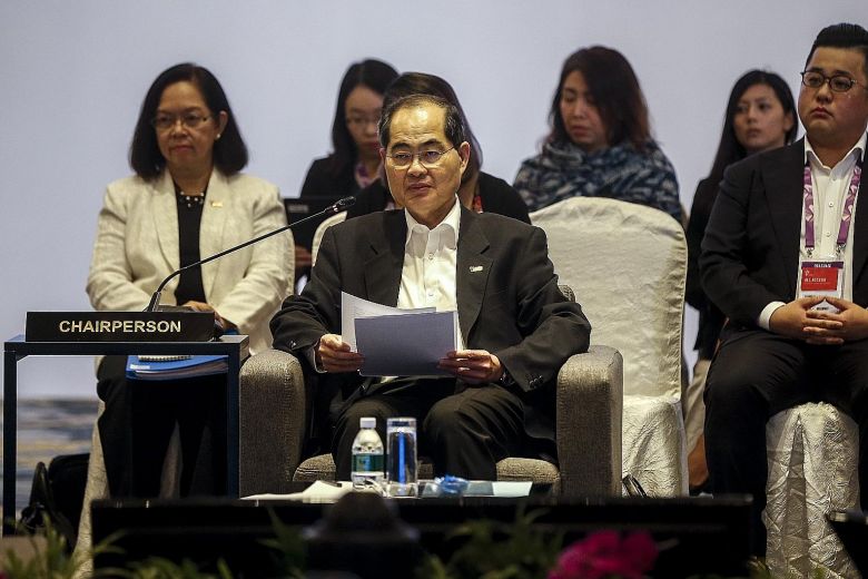 Bộ trưởng Thương mại và Công nghiệp Singapore, ông Lim Hng Kiang phát biểu tại Hội nghị Hẹp Bộ trưởng Kinh tế ASEAN. Ảnh: EPA-EFE
