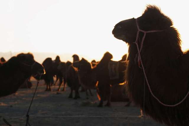 Lạc đà dưới ánh hoàng hôn trong lễ hội Temeenii Bayar. Ảnh: Reuters