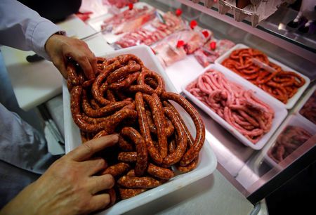 Một người bán thịt sắp xếp xúc xích tại cửa hàng ở thành phố Marseille, Pháp. Ảnh: Reuters