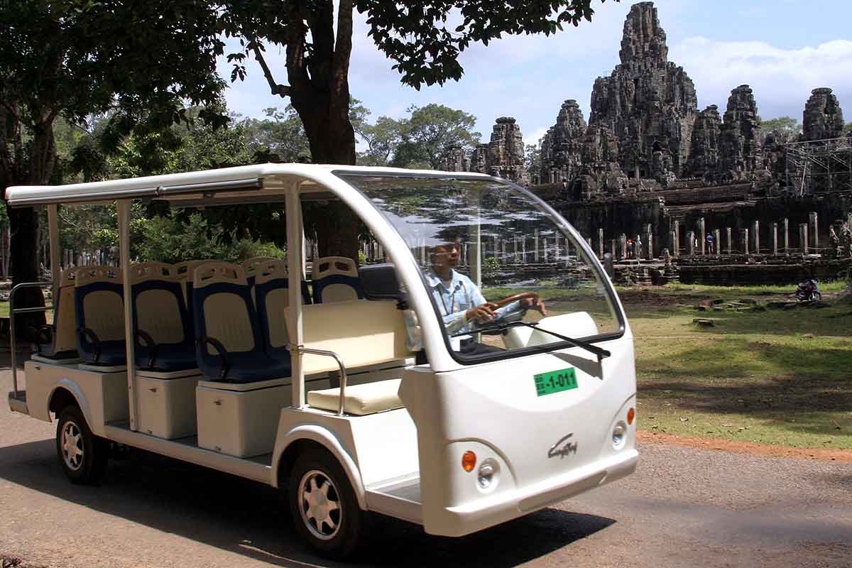 Một chiếc xe điện chạy qua trước đền Bayon ở trung tâm của Angkor Thom, tỉnh Xiêm Riệp, Campuchia. Ảnh: AFP