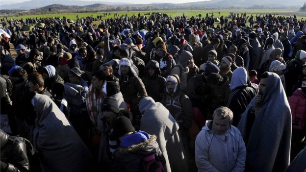 | Dòng người di cư trên biên giới Hy Lạp-Macedonia. Ảnh: BBC |