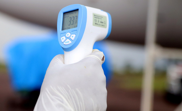 Nhân viên y tế kiểm tra thân nhiệt của hành khách tại sân bay thành phố Mbandaka, ngày 19-5 - Ảnh: REUTERS