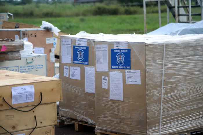 Hỗ trợ y tế cùng vắc-xin phòng Ebola của WHO đã đến sân bay thành phố Mbandaka, ngày 19-5 - Ảnh: REUTERS