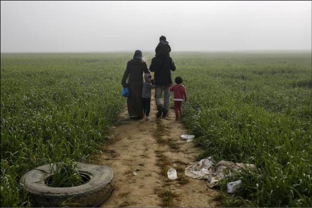 Một gia đình tị nạn đi qua cánh đồng trên khu vực biên giới Hy Lạp-Macedonia. Ảnh: Reuters